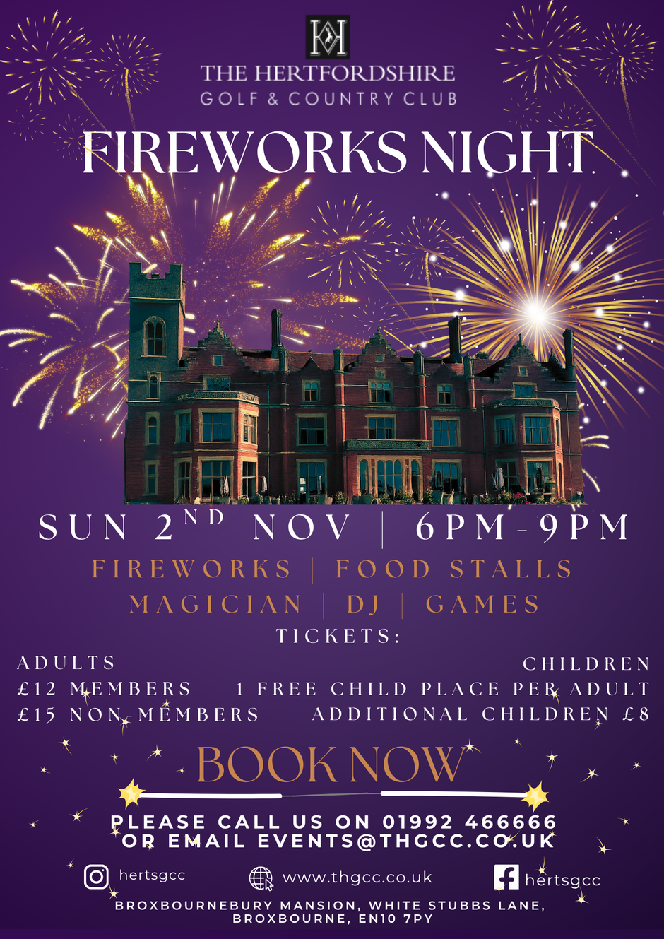 To book please call us on 01992466666 or email us: events@thgcc.co.uk